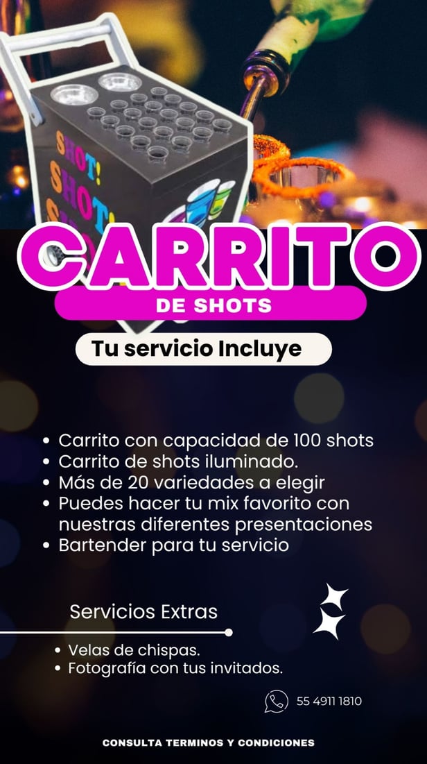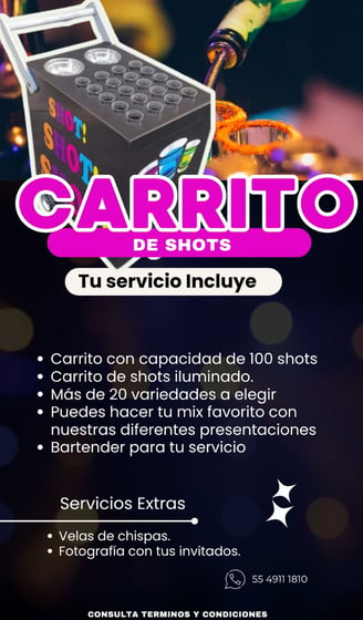 “¿Listo para una experiencia única? Nuestro carrito de shots te llevará a un viaje de sabores inolvidables.”